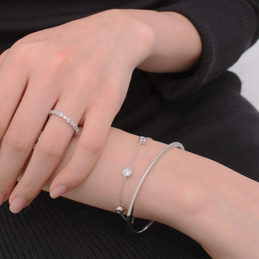 This round bezel bracelet embodies minimalist elegance, with a single sparkling stone that captures and reflects light effortlessly.
