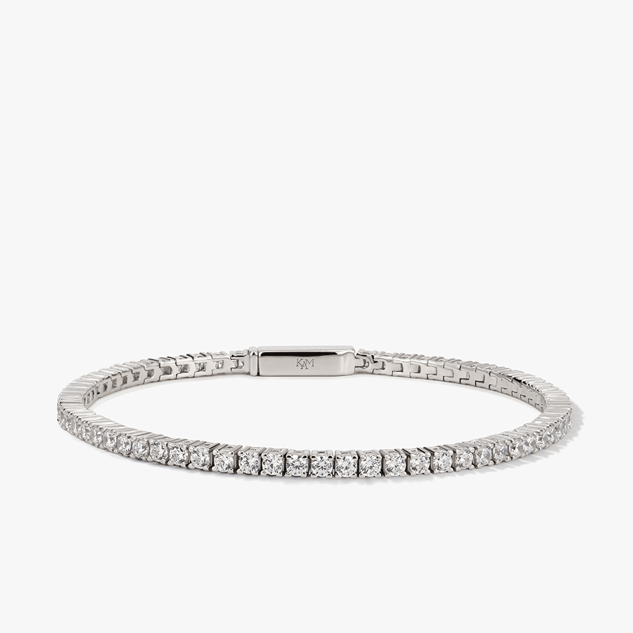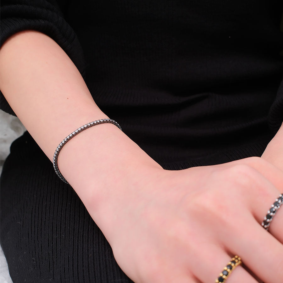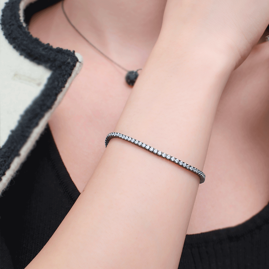 A very delicate - this tennis bracelet where light becomes an icon. Tiny stones set along a sleek, thin chain sparkle like captured starlight, shifting gently with every movement. The stones sparkle softly as they touch, creating a delicate dance of light.